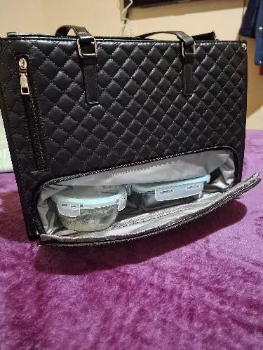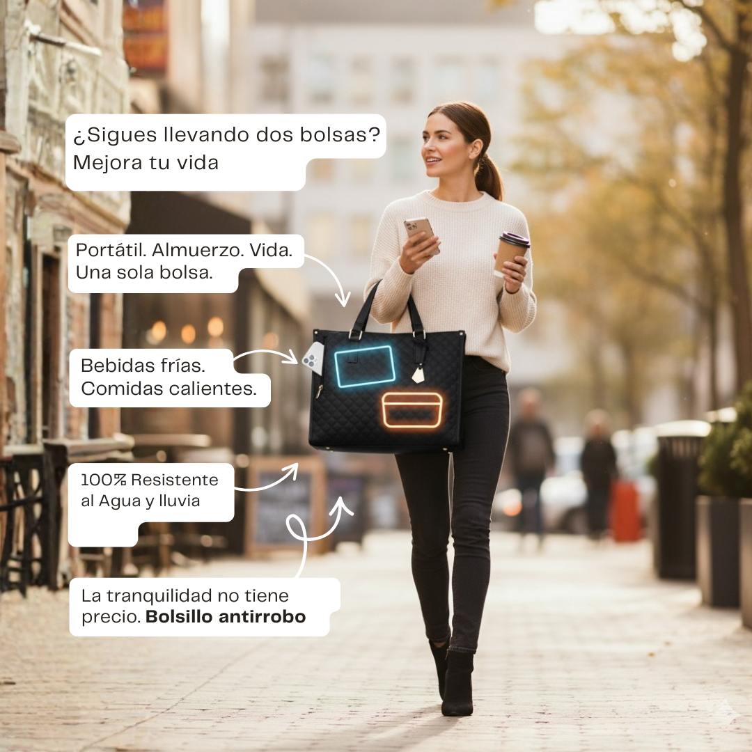 Imagina tener todo lo que necesitas en un elegante y organizado bolso. Olvídate de buscar a tientas cómo meter tu almuerzo, portátil y objetos personales en diferentes bolsas. Este bolso tote todo en uno reúne lo esencial para el trabajo, el almuerzo y tus cosas personales en un solo bolso con estilo y fácil de llevar.